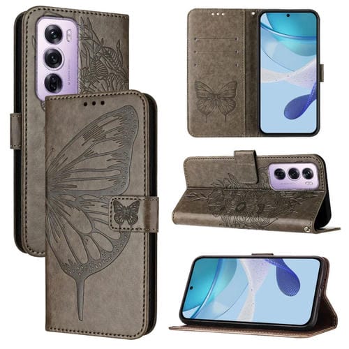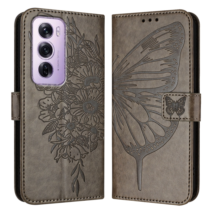 Funda de Cuero con Relieve de Mariposa para Oppo Reno12 Pro 5G (Gris)