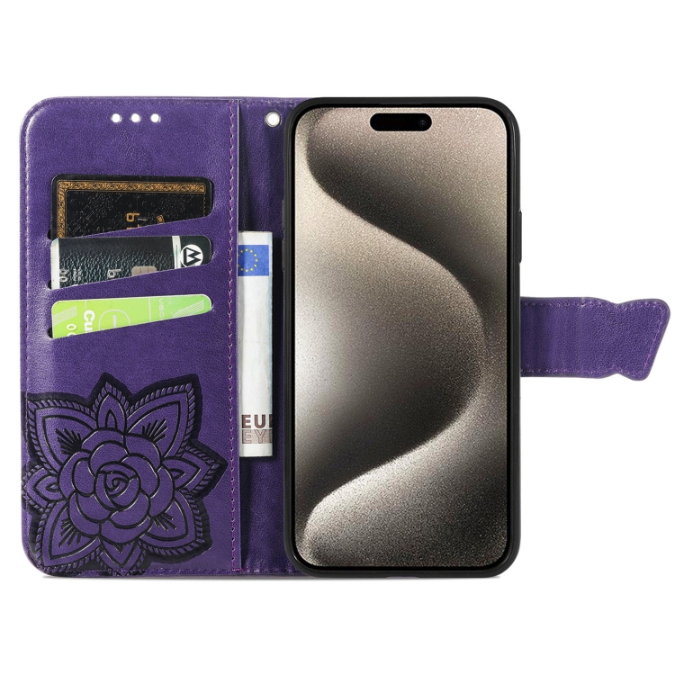 Funda de Cuero para iPhone 16 Plus con Relieve de Mariposa y Flor (Morado)