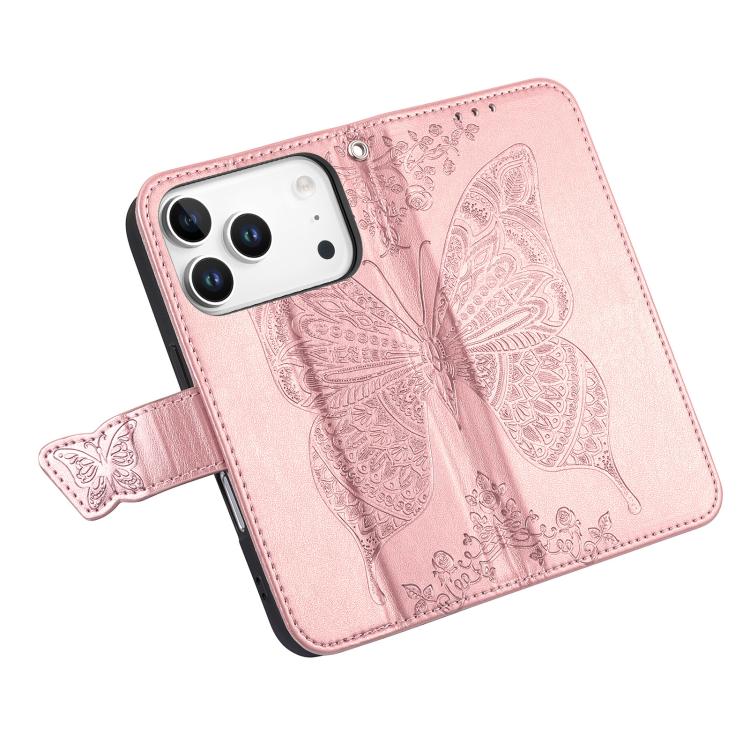 Funda de cuero con relieve de mariposa y flor para iPhone 17 Pro (oro rosa)