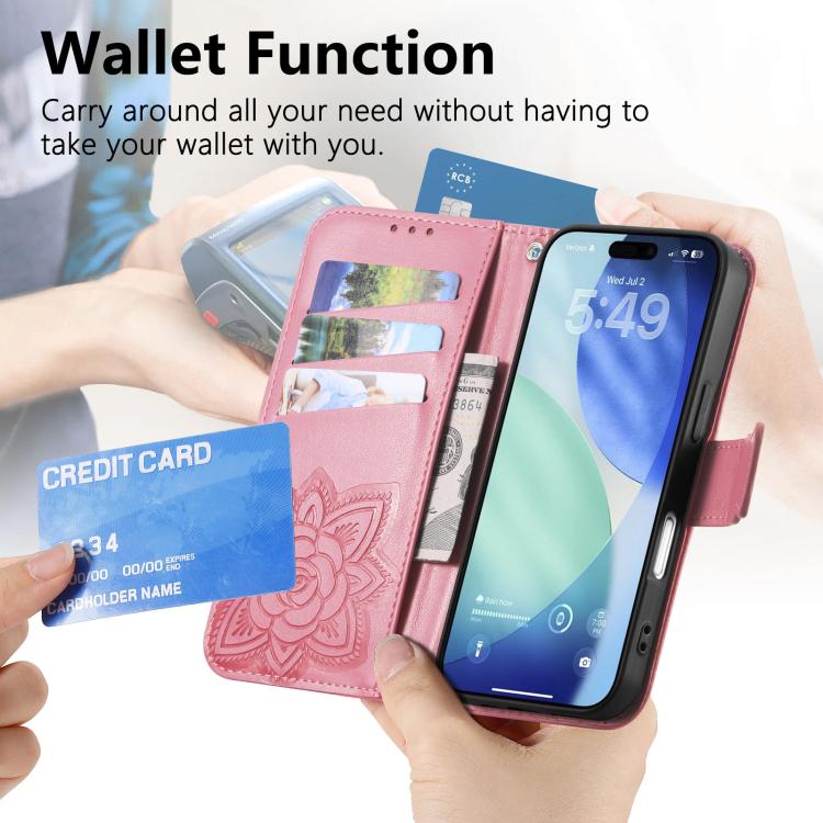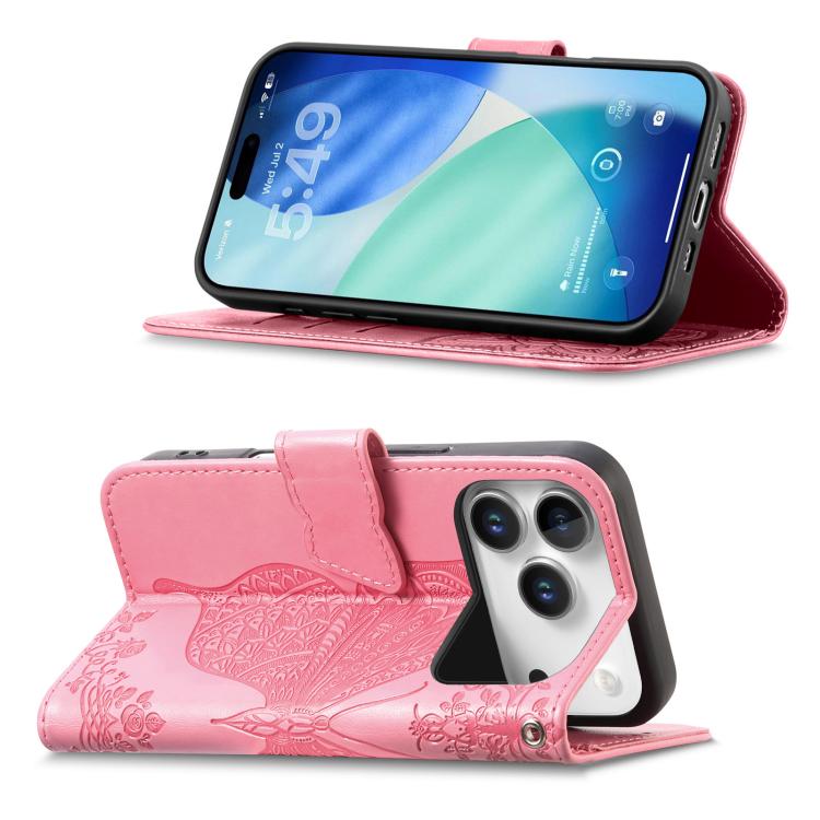 Funda de cuero con relieve de mariposa y flor para iPhone 17 Pro (rosa)