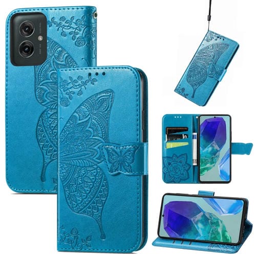 Funda de Cuero con Relieve Mariposa y Flor para Motorola Moto G55 (Azul)