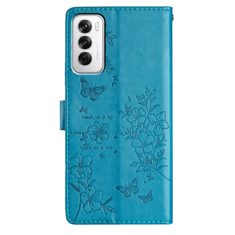 Funda de Cuero con Relieve de Mariposa y Flor para Oppo Reno12 Pro 5G Global (Azul)