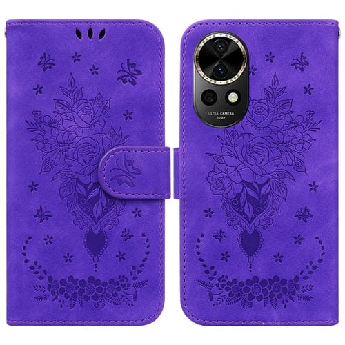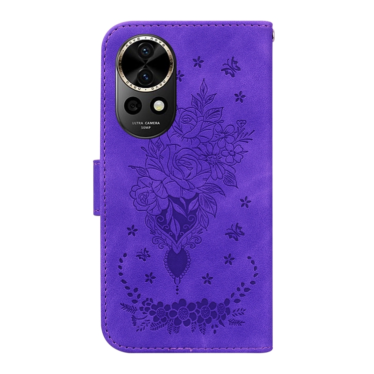 Funda de Cuero con Relieve Mariposa y Rosa para Huawei Nova 12 (Morado)