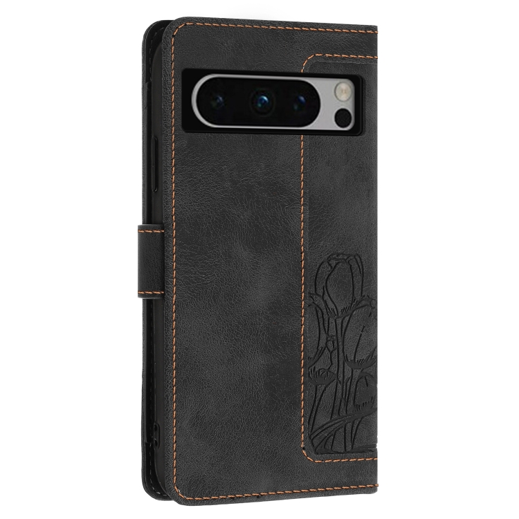 Funda de Cuero con Relieve de Tulipanes para Google Pixel 8 Pro con Cordón (Negro)