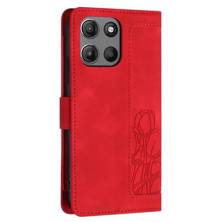 Funda de Cuero con Relieve de Tulipanes para Motorola Moto G Play 2025 con Cordón (Rojo)