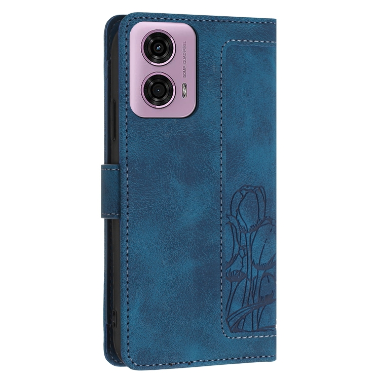 Funda de Cuero con Relieve de Tulipanes para Motorola Moto G Power 5G 2024 con Cordón (Azul)