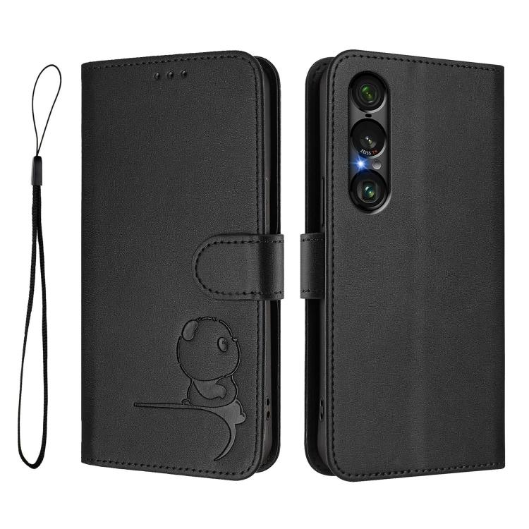 Funda de cuero con relieve RFID y cordón para Sony Xperia 1 VII (negro)