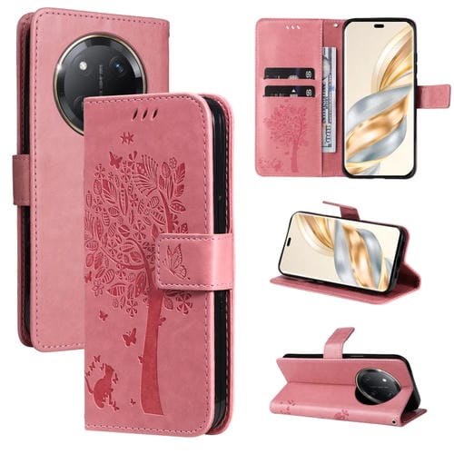 Funda de Cuero con Tapa para Honor X9C 5G Global con Estampado de Árbol y Gato (Rosa)
