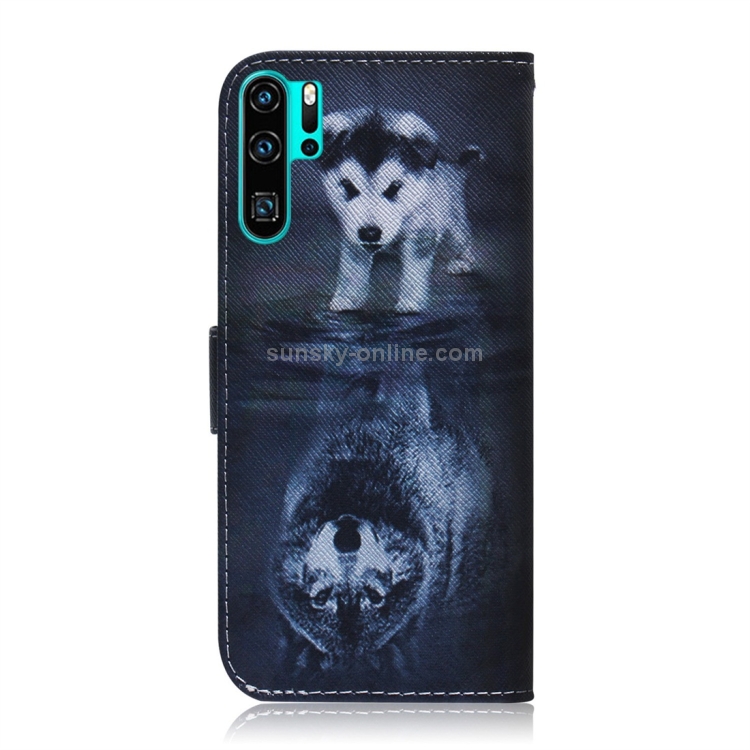 Funda de Cuero con Tapa Horizontal para Huawei P30 Pro con Dibujo de Lobo y Perro, Soporte, Ranuras y Billetera