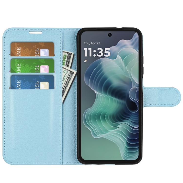 Funda de Cuero con Tapa Horizontal y Textura de Lichi para Motorola Moto G35 con Soporte (Azul)