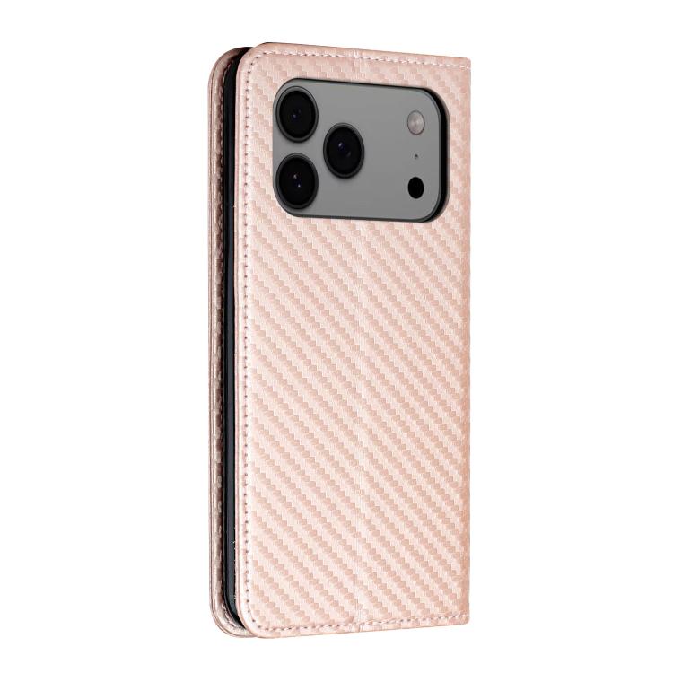 Funda de cuero con tapa magnética y textura de fibra de carbono para iPhone 17 Pro (oro rosa)