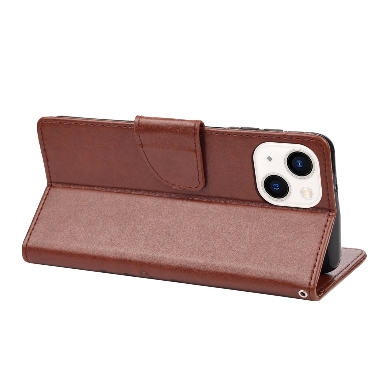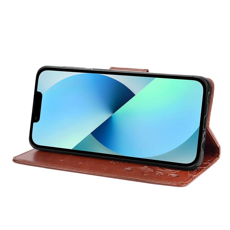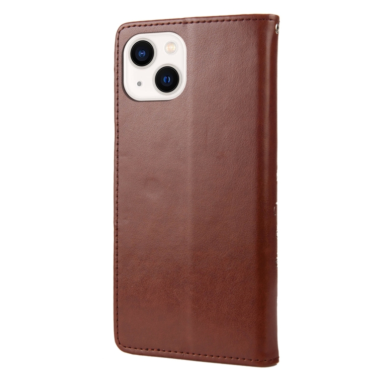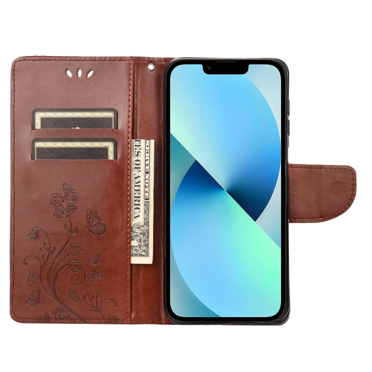 Funda de Cuero con Tapa para iPhone 14 Estampado de Flores de Mariposa (Marrón)