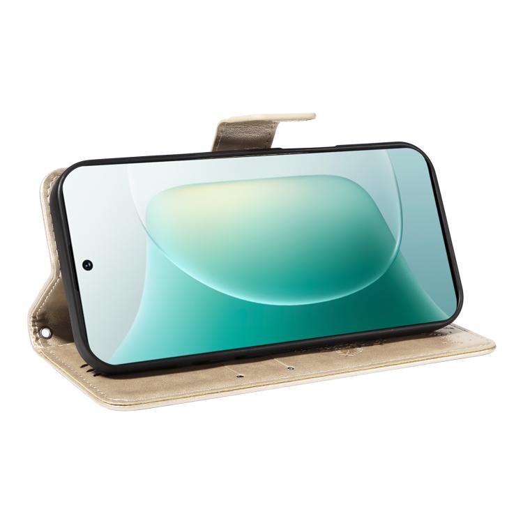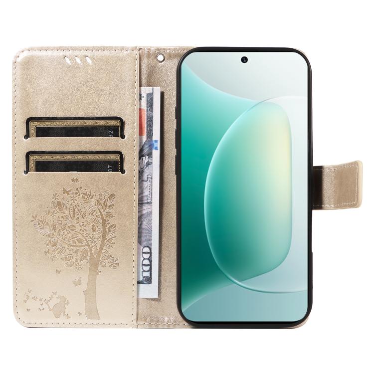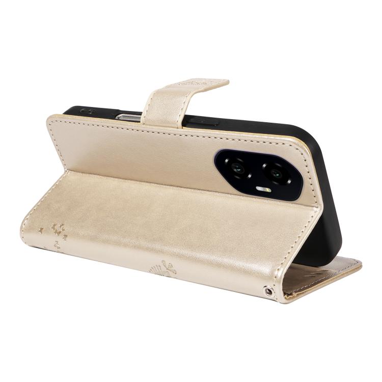 Funda de Cuero con Tapa para Honor 300 Diseño Árbol y Gato en Relieve (Dorada)