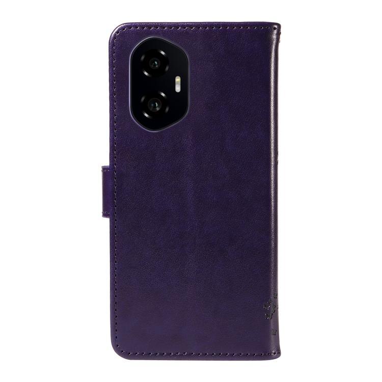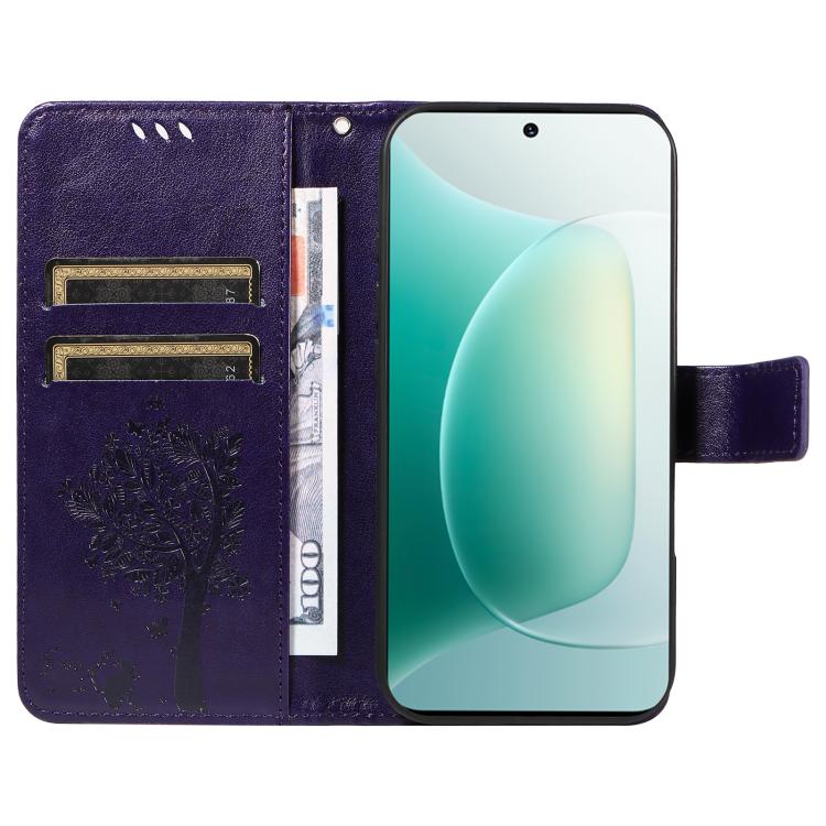 Funda de Cuero con Tapa para Honor 300 con Diseño Árbol y Gato en Relieve (Morado)