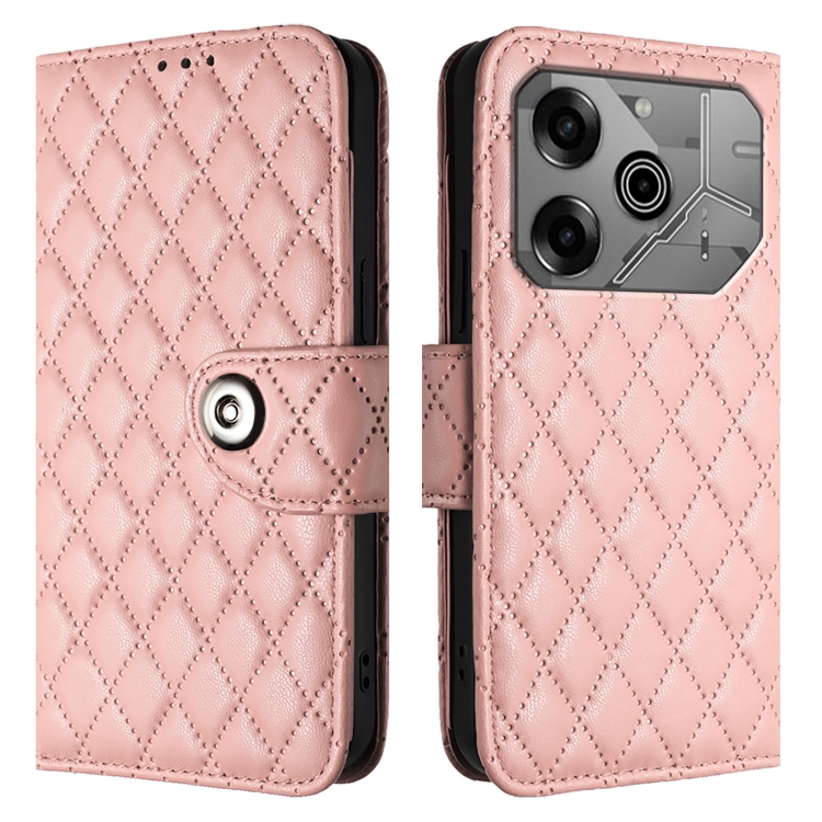 Funda de Cuero con Tapa y Cordón para Teléfono Tecno Pova 6 Neo con Textura Rombínica (Rosa Coral)