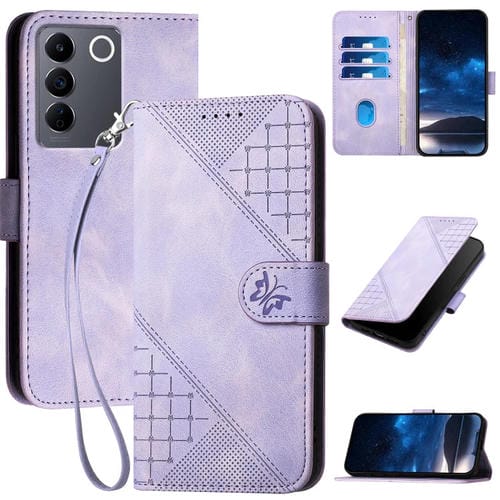 Funda de Cuero con Tapa y Cordón para Vivo V27E 4G Global Yx0080 con Diseño En Relieve de Mariposa y Cuadrícula (Morado Claro)