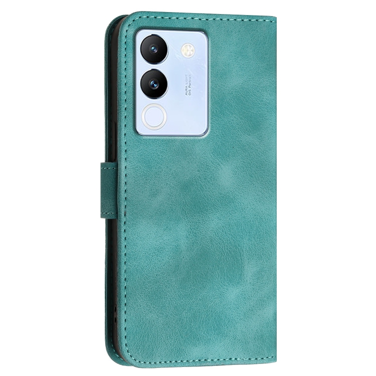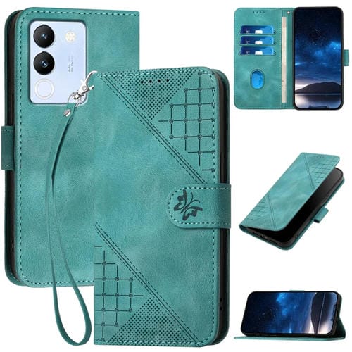 Funda de Cuero con Tapa y Cordón para Vivo V29E 5G Global Yx0080 con Diseño En Relieve de Mariposa y Cuadrícula (Azul Claro)