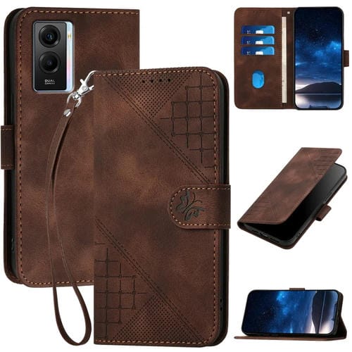 Funda de Cuero con Tapa y Cordón para Vivo Y75 5G Global Yx0080 con Diseño En Relieve de Mariposa y Cuadrícula (Café)