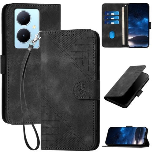 Funda de Cuero con Tapa y Cordón para Vivo Y78+ 5G Global / V29 Lite Yx0080 con Diseño En Relieve de Mariposa y Cuadrícula (Negro)