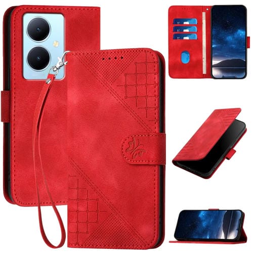Funda de Cuero con Tapa y Cordón para Vivo Y78+ 5G Global / V29 Lite Yx0080 con Diseño En Relieve de Mariposa y Cuadrícula (Rojo)
