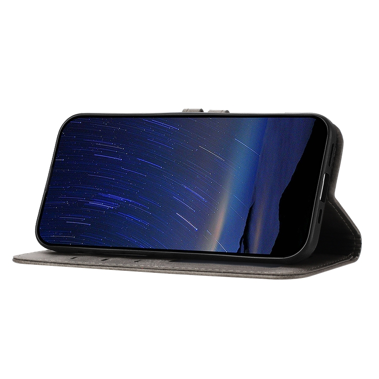 Funda de Cuero con Tapa para iPhone 16 Diseño de Gato Feliz En Relieve (Gris)