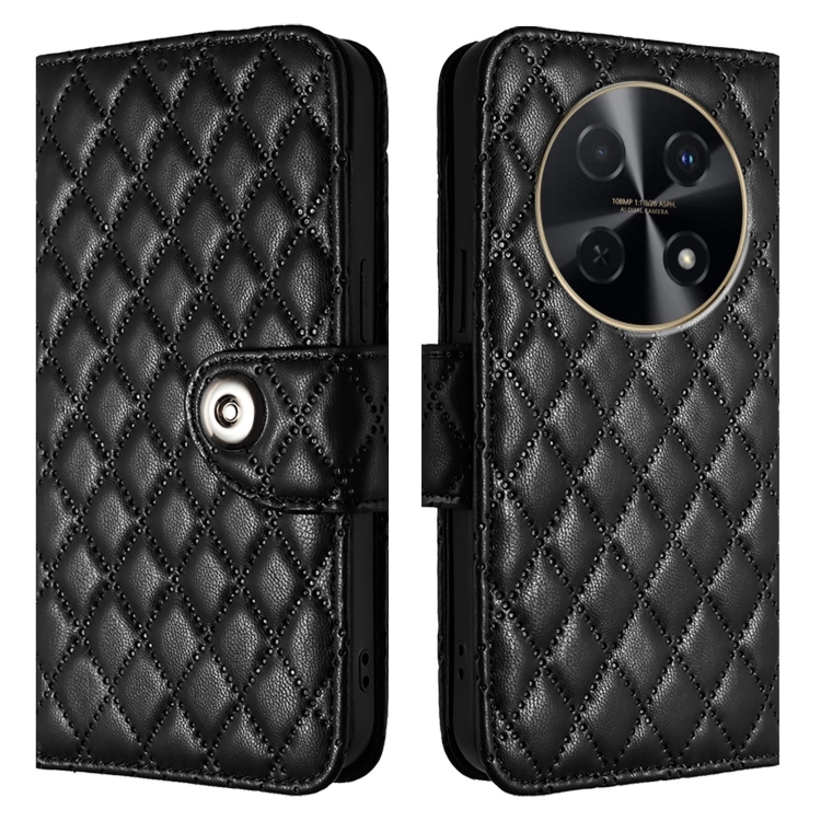 Funda de Cuero con Tapa y Textura Rombal para Huawei Nova 12I con Cordón (Negro)