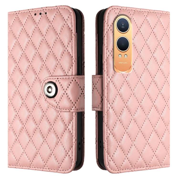 Funda de Cuero con Tapa y Textura Rombal para OnePlus Nord CE4 Lite con Cordón (Rosa Coral)