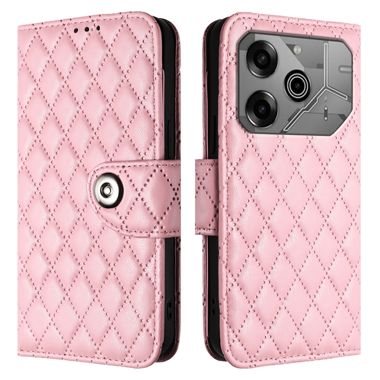 Funda de Cuero con Tapa y Textura Rombal para Tecno Pova 6 Neo con Cordón (Rosa)