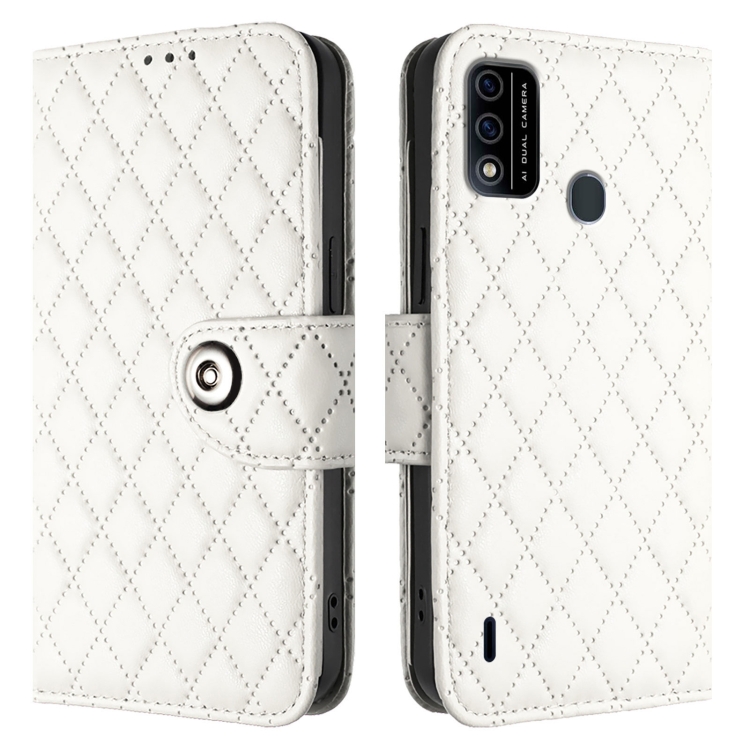 Funda de Cuero con Tapa y Textura Rombal para Teléfono Itel A48 con Cordón (Blanco)