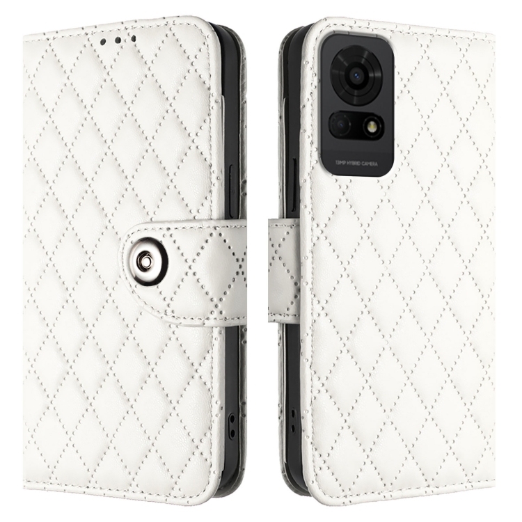 Funda de Cuero con Tapa y Textura Rombal para TCL 50 Le 5G con Cordón (Blanco)