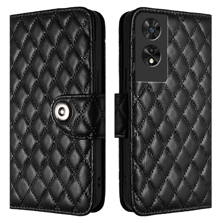 Funda de Cuero con Tapa y Textura Rombal para Teléfono TCL 505 con Cordón (Negro)