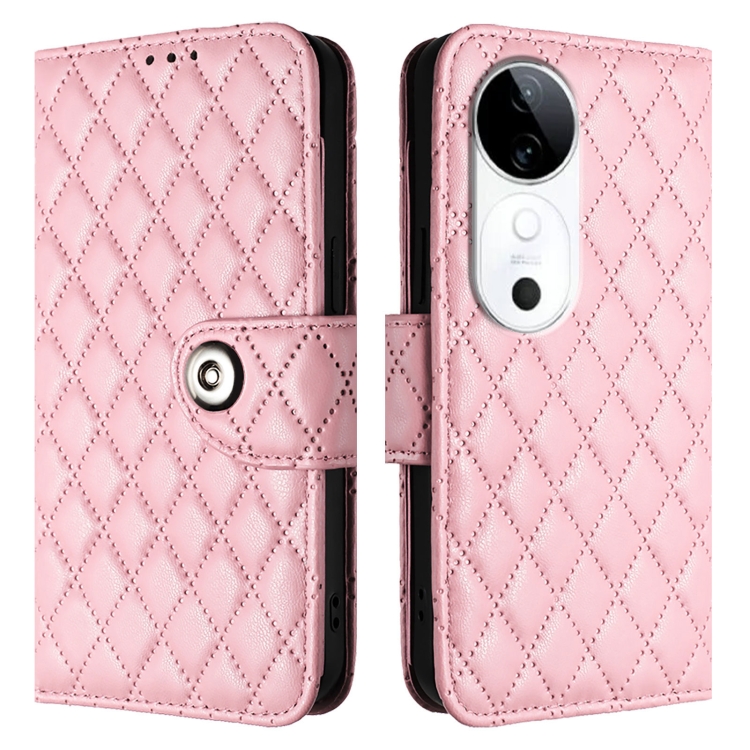 Funda de Cuero con Tapa y Textura Rombal para Teléfono Vivo S19 con Cordón (Rosa)