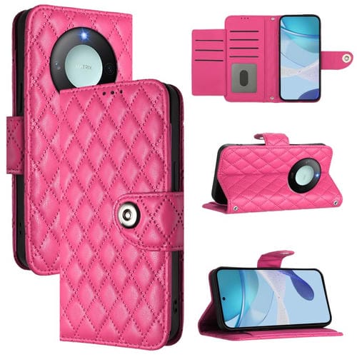 Funda de Cuero con Tapa y Cordón para Honor X9C Smart 5G con Textura Rómbica (Rosa y Rojo)
