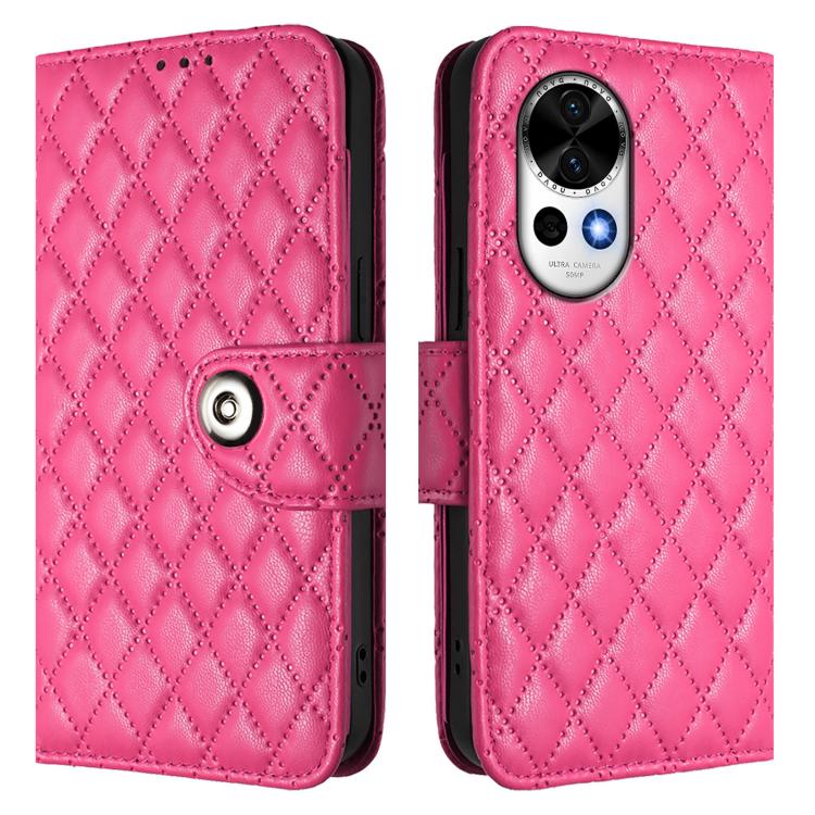 Funda de Cuero con Tapa y Textura Rómbica para Huawei Nova 13 y Nova 12 con Cordón (Rosa y Rojo)