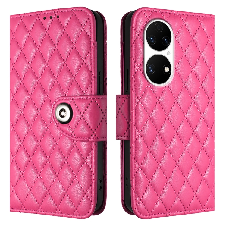 - 1x Funda de Cuero con Tapa y Textura Rómbica para Huawei P50 Pro con Cordón (Rosa y Rojo)