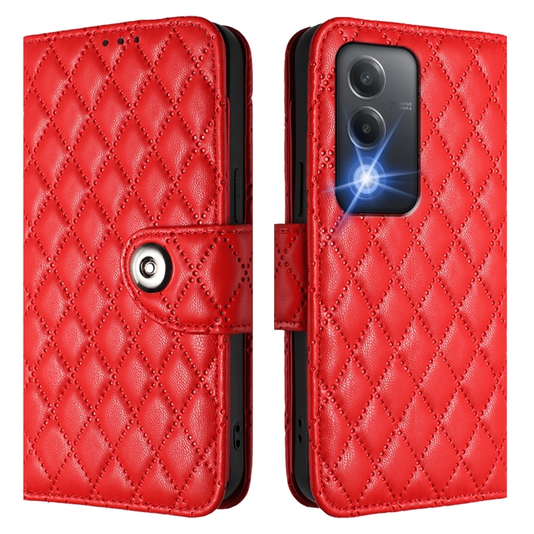 Funda de Cuero con Tapa y Textura Rómbica para Teléfono Oppo A3 Pro 5G de la India con Cordón (Rojo)