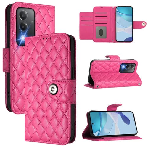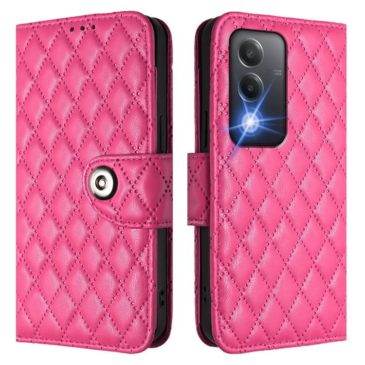 Funda de Cuero con Tapa y Textura Rómbica para Teléfono Oppo A3 Pro 5G de la India con Cordón (Rosa Rojo)