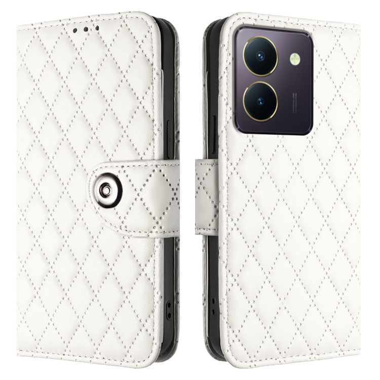 Funda de Cuero con Tapa y Textura Rómbica para Vivo Y27 5G/Y27S con Cordón (Blanco)
