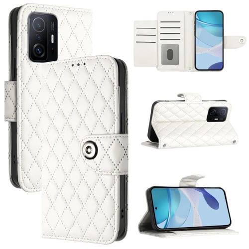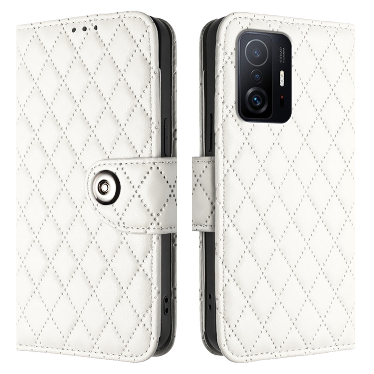 Funda de Cuero con Tapa y Textura Rómbica para Xiaomi 11T/11T Pro con Cordón (Blanco)