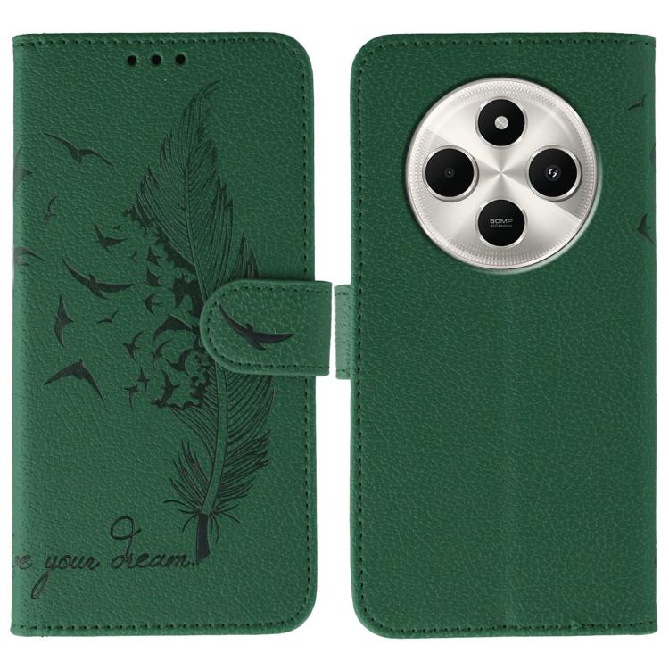 Funda de cuero con textura de lichi y estampado de plumas para Xiaomi Poco C75 4G (verde)