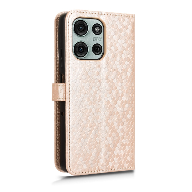 Funda de Cuero Motorola Moto G75 5G con Textura de Puntos en Panal (Dorada)