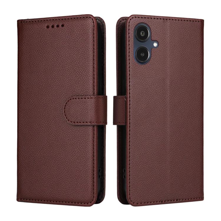 Funda de cuero con textura Litchi para Samsung Galaxy A25e, con bloqueo RFID y capacidad para 3 tarjetas (marrón)