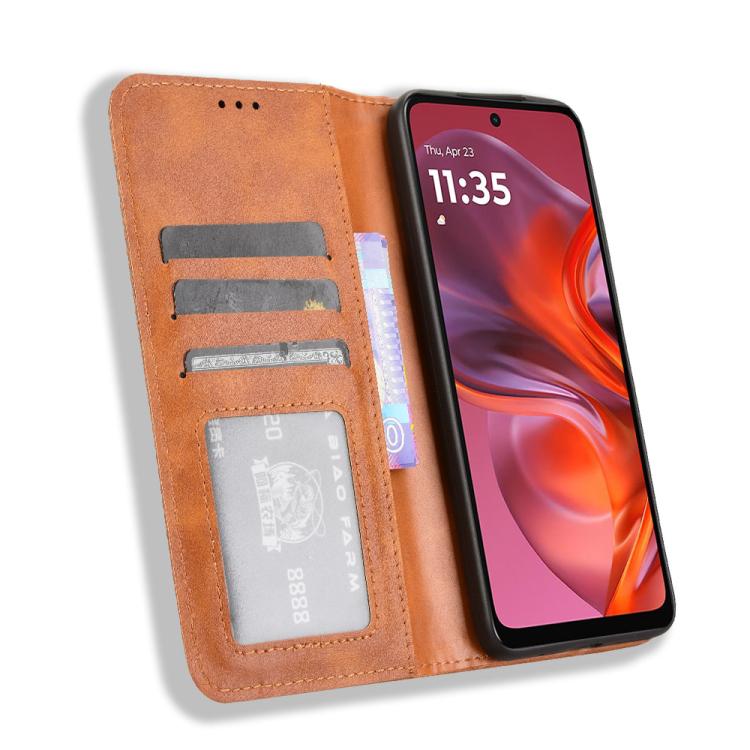 Funda de Cuero Motorola Moto G05 4G y E15 4G con Textura Retro y Hebilla Magnética (Marrón)