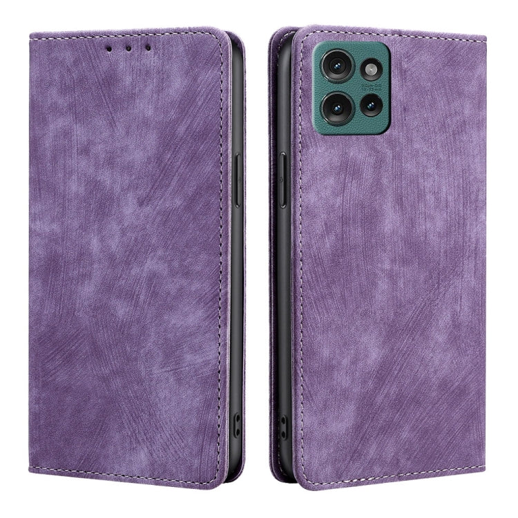 Funda de Cuero Magnética con Cepillo Antirrobo RFID para Motorola Edge 50 5G (Morado)