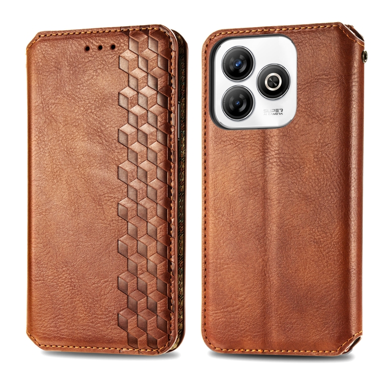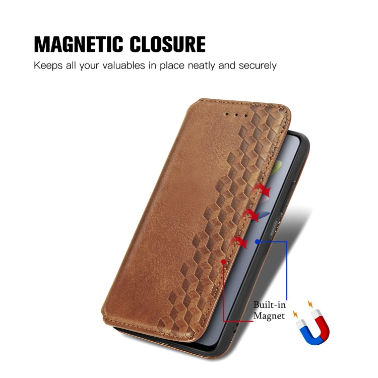 Funda de Cuero Magnética para ZTE Blade A75 4G con Diseño de Cuadrícula Cúbica (Marrón)