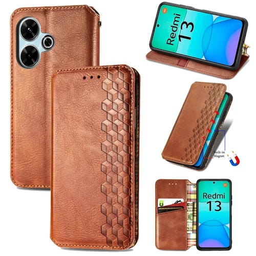 Funda de Cuero Magnética con Rejilla Cúbica Prensada para Redmi 13 4G (Marrón)