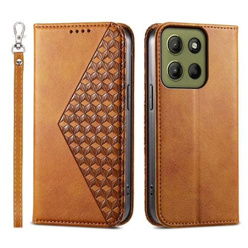 Funda de Cuero Magnética Motorola Moto G15 Textura de Becerro y Cuadrícula Cúbica (Amarillo)