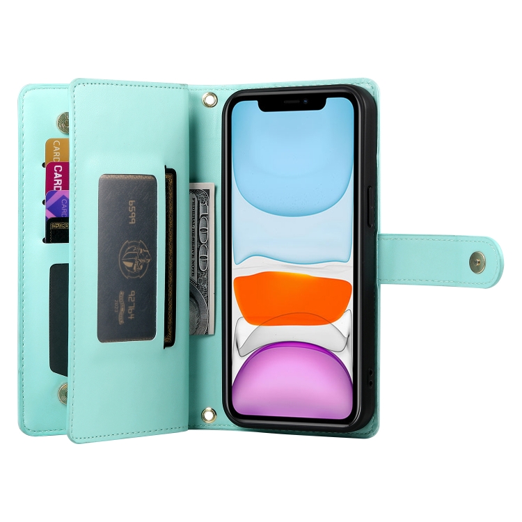 Funda para iPhone 11 Cuero Nueve Ranuras Tarjetas Cremallera (Verde Menta)
