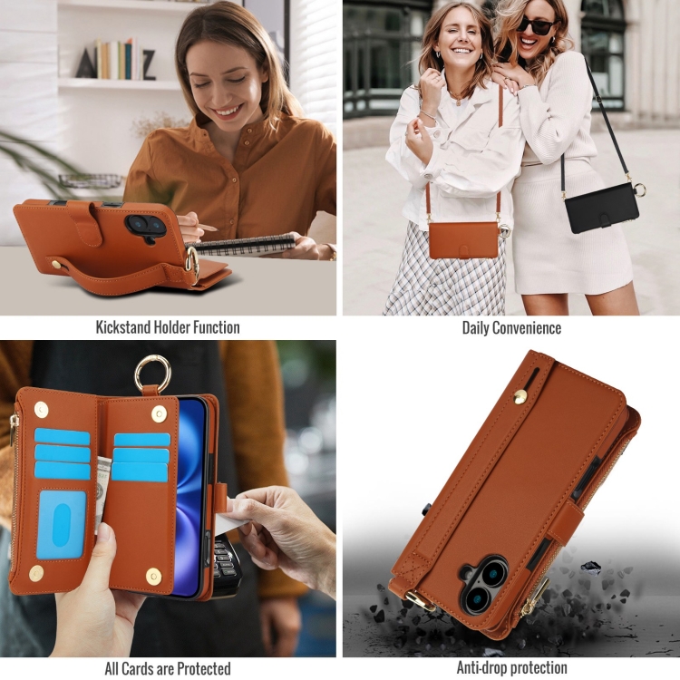 Funda para Teléfono de Cuero con Billetera Multifuncional y Anillo Cruzado para iPhone 16 (Marrón)