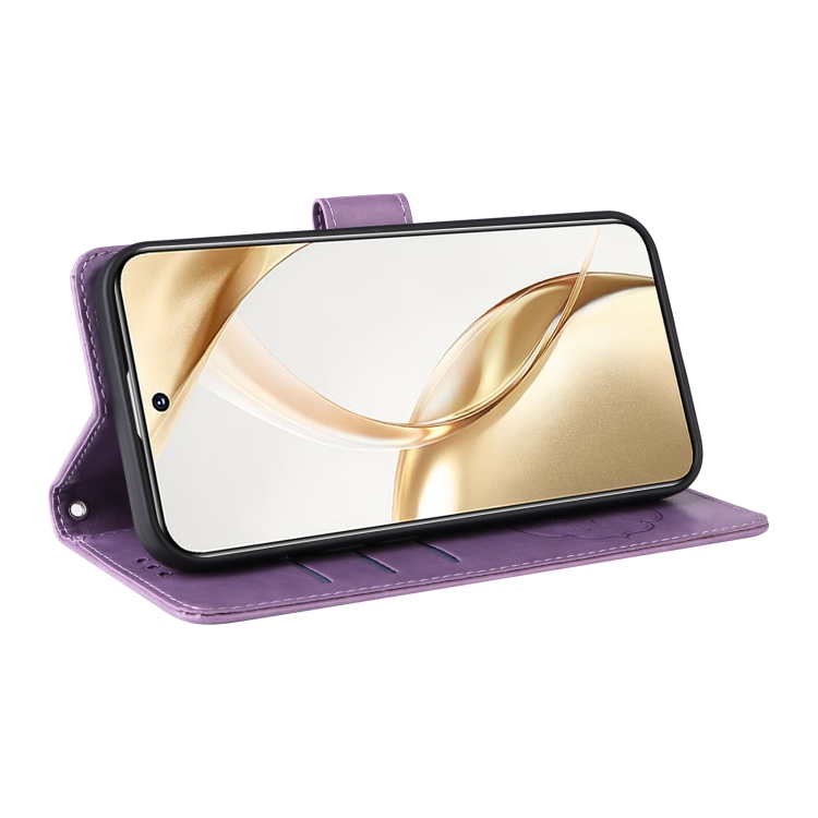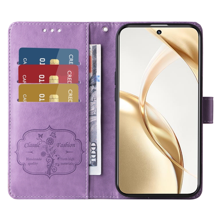 Funda de Cuero para Honor 200 con Diseño de Flores y Mariposa en Relieve (Morado)